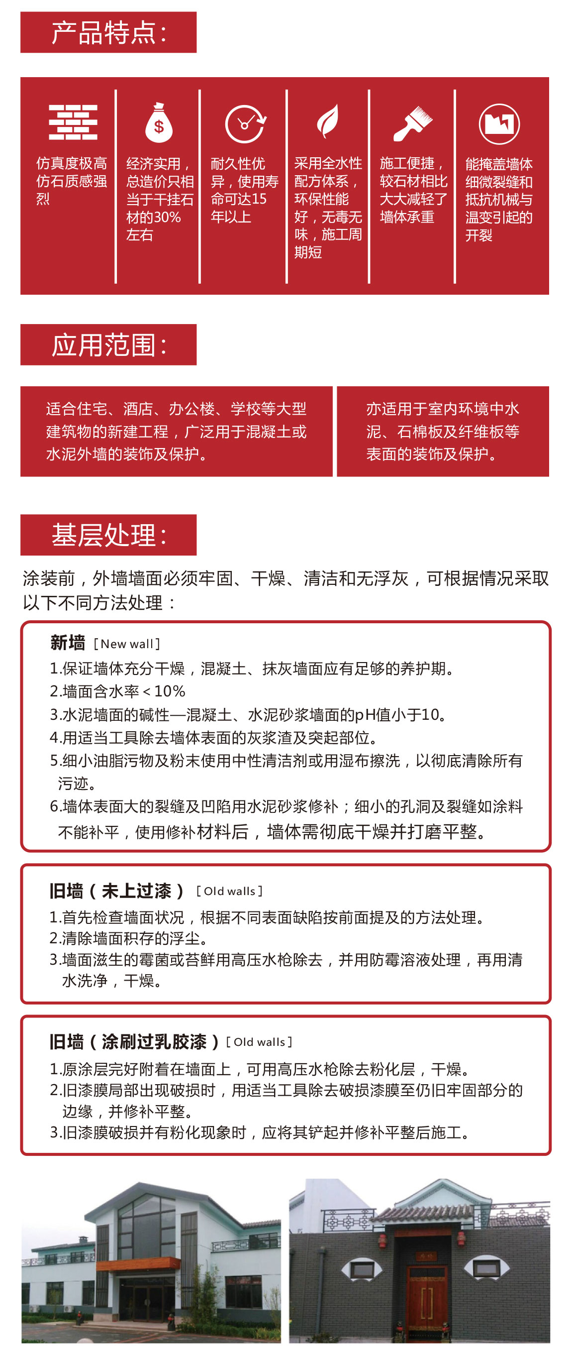 水包砂藝術(shù)水漆是佰麗聯(lián)漆研發(fā)的新一代水包砂產(chǎn)品,具有凹凸柔順,高仿真度、施工方便、不褪色、使用 壽命長(cháng)等優(yōu)點(diǎn);又具有天然真石漆透氣性好、抗開(kāi)裂好、質(zhì)感強烈、抗沖擊力強等優(yōu)點(diǎn),不受基面造型的影 響,適合多種基面,為高檔建筑物裝飾的上選之材。