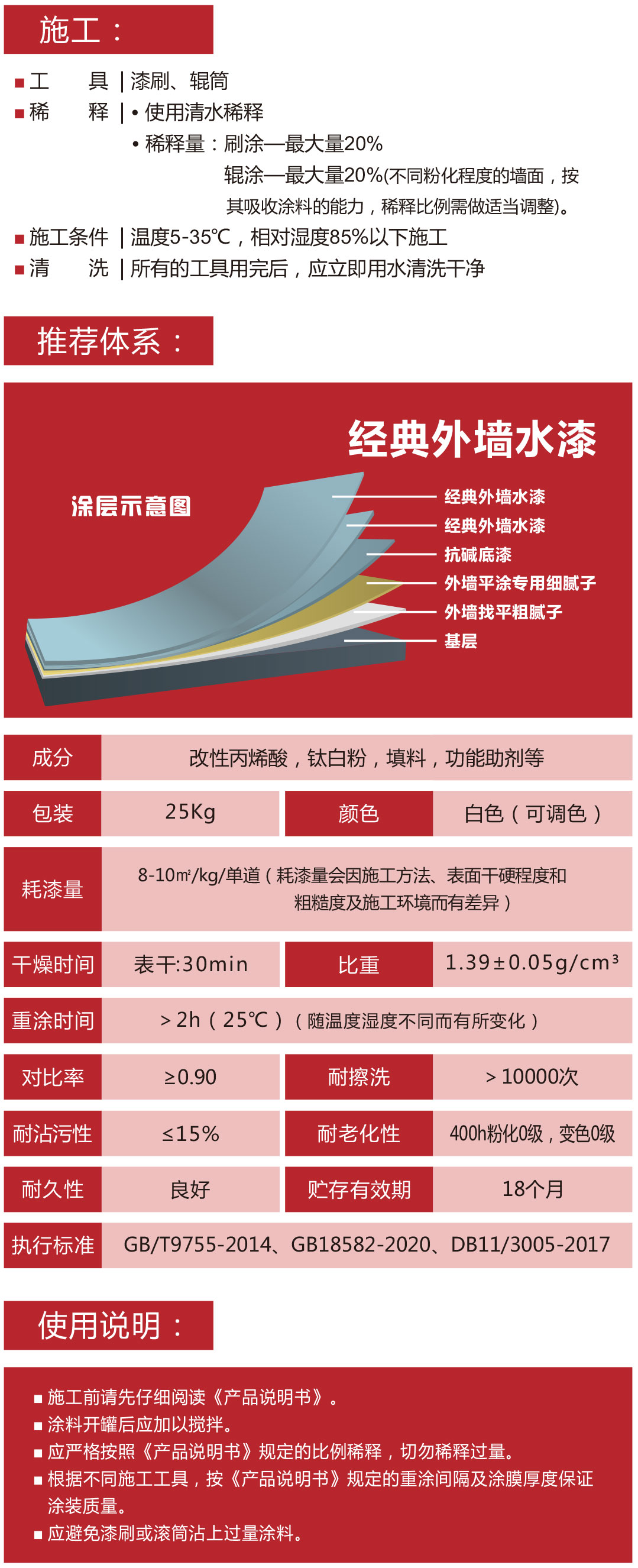經(jīng)典外墻水漆是一款改性丙烯酸類(lèi)外墻面漆,具有出色的保光保色性能及戶(hù)外耐久性,可廣泛用于混凝土、水泥及磚墻等外墻的裝飾及保護。