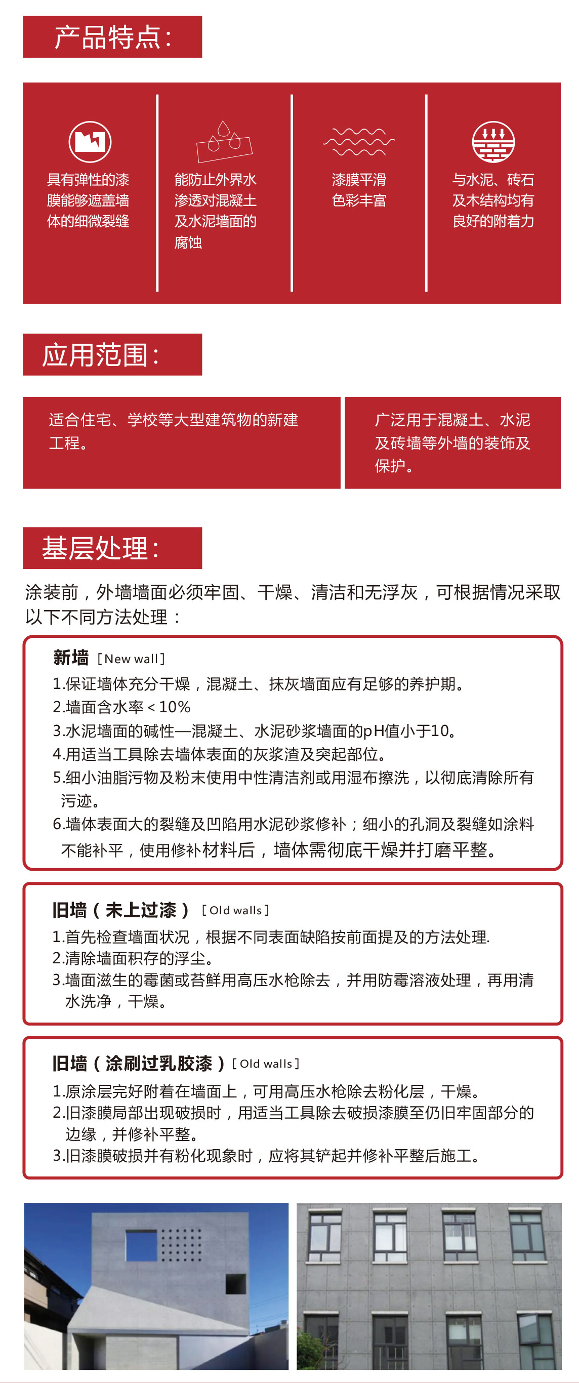 高彈外墻水漆是一款丙烯酸彈性外墻面漆,具有防水、抗裂縫及耐雨痕等功能。