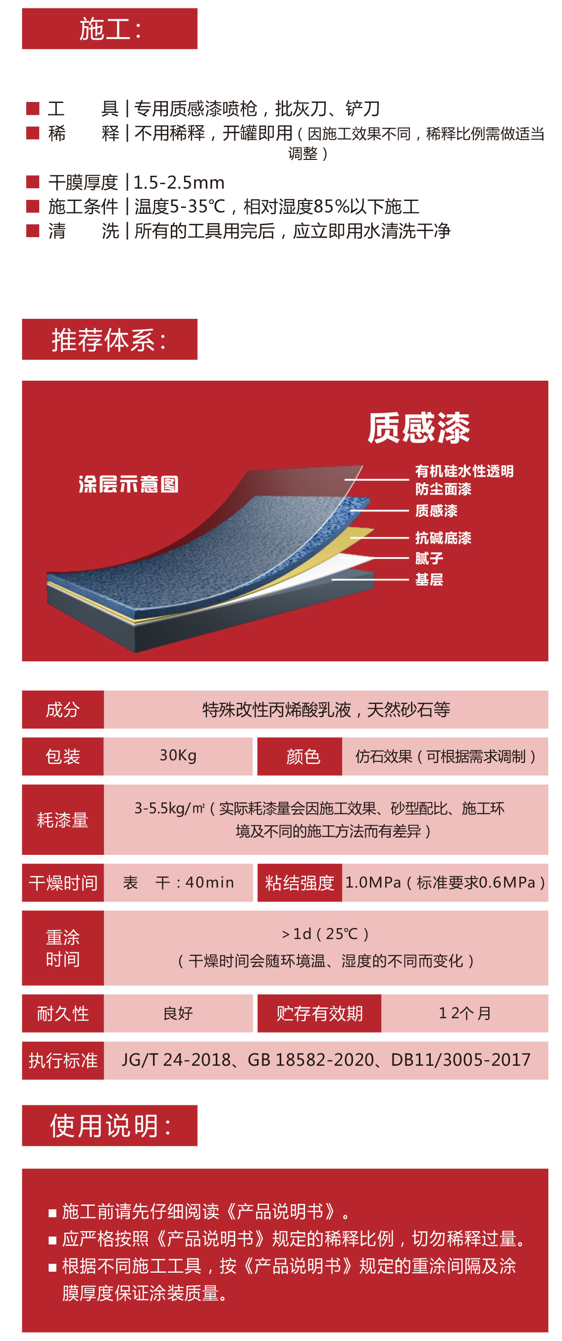 質(zhì)感漆是以天然砂石與合成樹(shù)脂為主體的砂壁狀涂料,具有優(yōu)良的耐候性和柔韌性,可長(cháng)時(shí)間保護建筑物的美 觀(guān),該產(chǎn)品顏色和紋理豐富,具有高強防水、功能抗污、彈性抗裂、低溫柔性、耐久保色、抗菌防霉、質(zhì)感分 明的優(yōu)異特性,可以讓用戶(hù)涂飾出各種粗狂別致的砂狀效果。